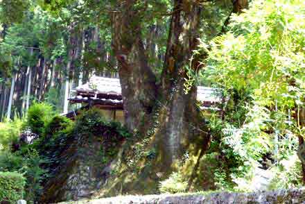 新城設楽の巨木・名木 に選ばれているカヤの木で、樹高15m、幹周り3.85mと3.35mという大木。 幹回りが2つあるのは、根元から2本に分かれて成長しているから。