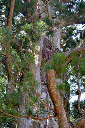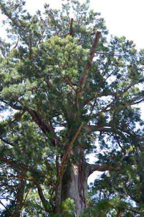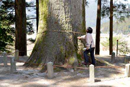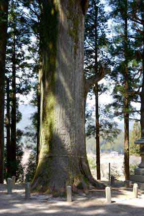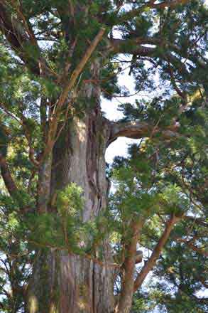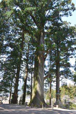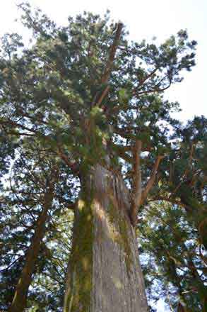 御神木の大杉は、樹高 31m、幹周 7.05m、推定樹齢 350年以上、見上げるばかりの杉の巨木、私のカメラでは全容を収めることが出来ない。