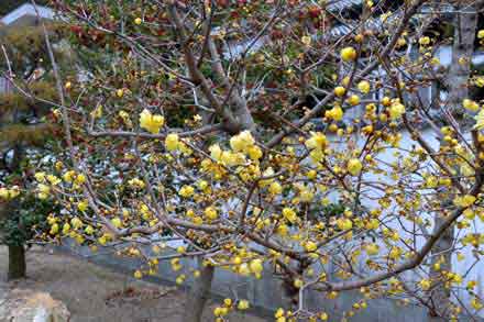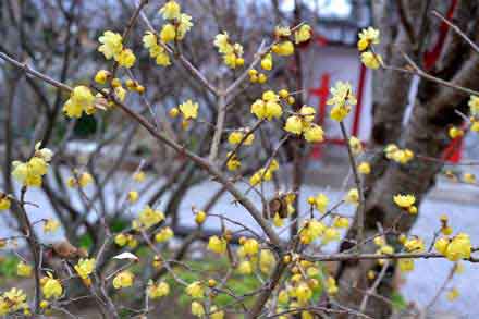 の赤門の左手前と、門をくぐってすぐの所に蝋梅の木があり、1月になるとほのかな香りを漂わせる。