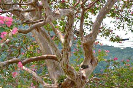 寺院の入り口には、サルスベリ(百日紅)の大木があり、8月になると紅色の花を咲かせる。サルスベリの木でここまで大きいのは珍しい。