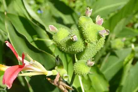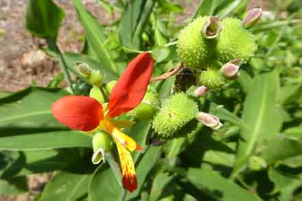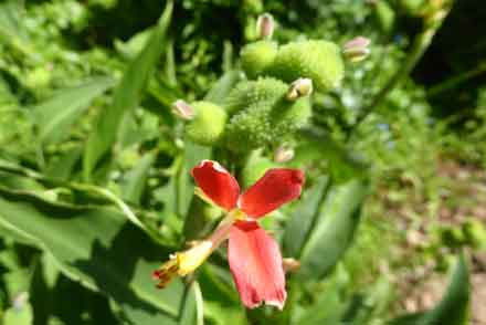 の脇で、赤い花が咲いていた・・・何と云う花かと調べてみたら「ダンドク」と云うそうな・・・