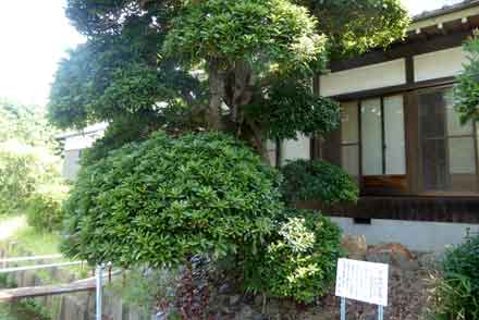 の本堂と墓地との間にあり、幹が縦に大きく裂け、亀裂の中は空洞になってるが、今は青々とした葉っぱがいっぱいに茂っている。