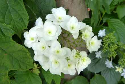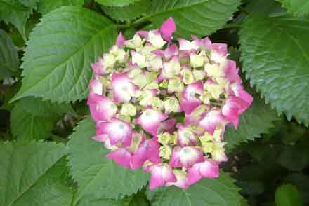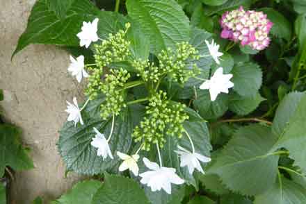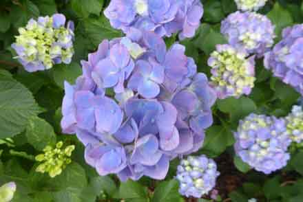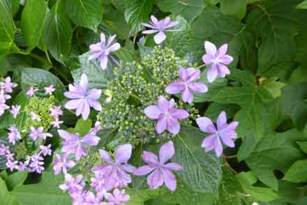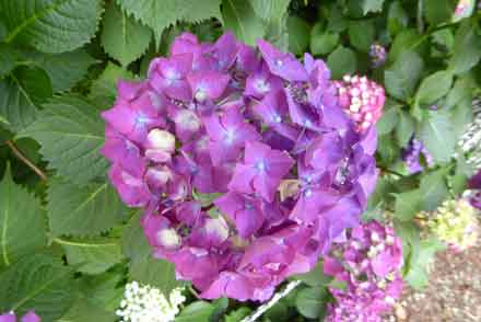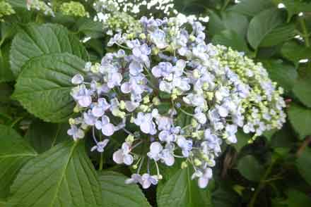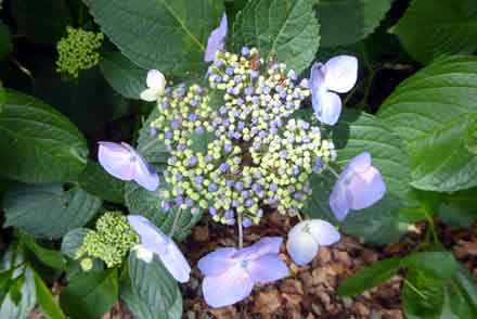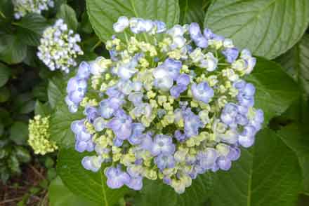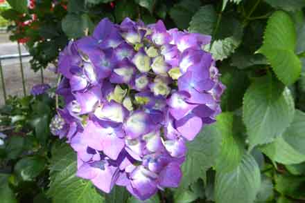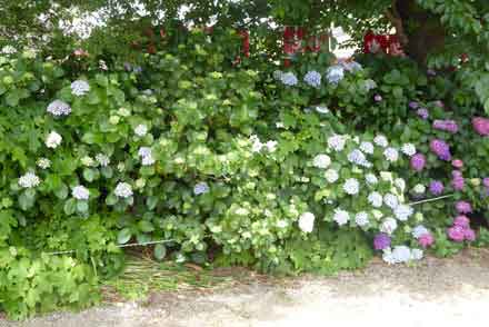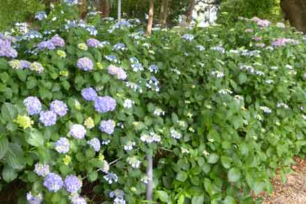 を訪れると、駐車場から境内までの道筋、神社北側の道路沿い等々、様々な所でアジサイの花が出迎えてくれる。