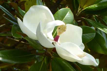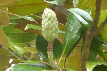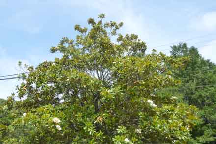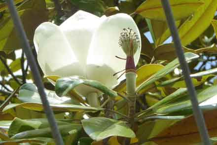 の山門の手前に大きなタイサンボクの木があり、初夏になると白い9枚の花弁からなる大きな碗状の花が上向きに咲いている。