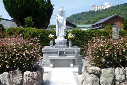 山門の左手前には綺麗な観音像がある( 2025年6月27日撮影 )。