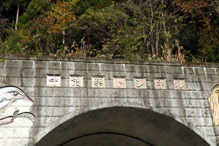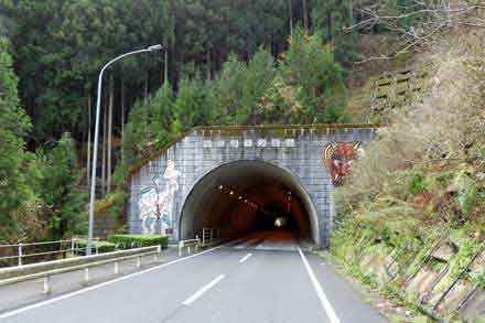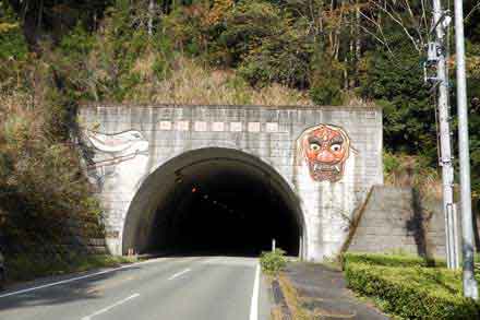 トンネルの出入り口には、花祭りの「鬼の面」と、町の花「やまゆり」、町の鳥「ウグイス」が描かれている。 因みに、町の木は「スギ」。
